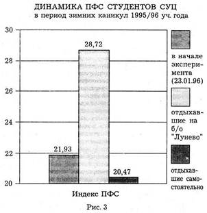 Опыт организации контроля ПФС среди студентов специализированного учебного центра по работе с инвалидами по слуху в МГТУ им. Н.Э. Баумана показывает, что возможность получения информации с количественной оценкой собственного состояния и анализа его динамики (в течение семестра она, как правило, отрицательная) вызывает живой интерес к средствам и методам парирования неудовлетворительной ситуации. Для примера приведем описание эксперимента по определению качества отдыха с точки зрения реабилитации психофизической функции, проведенного в период зимних каникул 1995/96 учебного года.