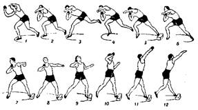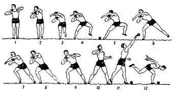 Рис. 2.3 - Техника толкания ядра из исходного положения „боком" к направлению толкания