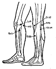 8. Точка St 36 («точка трех миль»). Симметричная точка, находится под коленной чашечкой в сторону внешней части болыпеберцовой кости (рис.). Снимает боль в коленных суставах, укрепляет мышцы, улутшает общее состояние организма.
