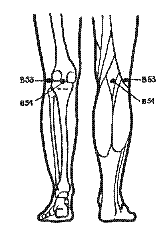 7. Точка St 35 («нос теленка»). Симметричная точка, расположена под коленной чашечкой в углублении с внешней стороны (рис.). При воздействии на эту точку исчезают боли в коленных суставах, облегчается состояние при ревматизме ступней.