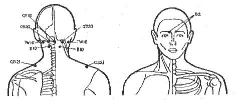5. Массаж точек GV 16 и В 2 производится одновременно. Большим пальцем левой руки нужно надавить на точку GV 16 под основанием черепа, а указательный и большой пальцы правой руки поставить на точки В 2 слева и справа и нажать на них, направляя движение вверх, в сторону лба Воздействовать на эти точки следует в течение 1 минуты.