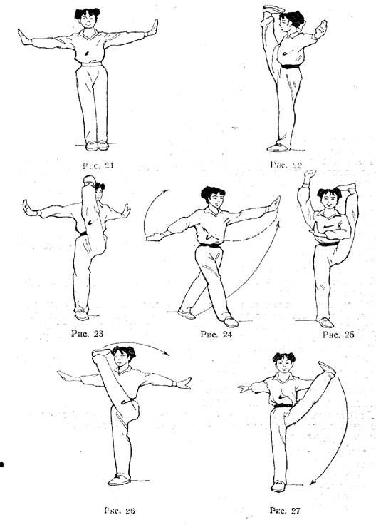 Д в и ж е н и я: с силой выполнить мах правой ногой прямо перед собой. Следить за тем, чтобы корпус оставался ровным и обе ноги были прямыми (рис. 22), затем выполнить мах левой ногой (рис. 23).