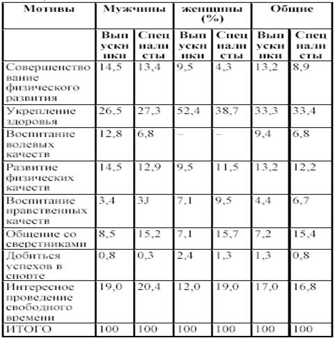 Большое значение в формировании сознательного отношения к занятиям физкультурой и спортом имеет мотивация студентов. Студентам был задан вопрос: "Как бы Вы охарактеризовали свое стремление заниматься физкультурой и спортом?" Им было предложено из восьми вариантов ответов указать соответствующие их мнению. Результаты ответов студентов представлены в табл.1. Как видно из табл.1, наиболее значимым мотивом занятий физкультурой и спортом студенты и специалисты назвали "укрепление здоровья" (33,3 и 33,4%). На втором месте по значимости стоит мотив "интересное проведение свободного времени" (17,0 и 16,8%). Таблица 1 МОТИВАЦИЯ ЗАНЯТИЙ ФИЗКУЛЬТУРОЙ И СПОРТОМ У СТУДЕНТОВ И СПЕЦИАЛИСТОВ