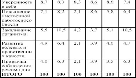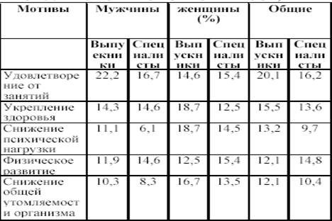 Студенты-выпускники и специалисты могут ретроспективно оценить результативность занятий физкультурой и спортом. Результаты анкетного опроса представлены в табл.2. Среди пяти первых по значимости факторов, определяющих результативность занятий физкультурой и спортом есть социальные ("удовлетворение от занятий" – 20,1 и 16,2%, "снижение общей утомляемости" – 12,1 и 10,4%), физические ("укрепление здоровья" – 15,5 и 13,6%, "физическое развитие" – 12,1 % и 14,8 %), психические ("снижение психической нагрузки" – 13,2% и 9,7%). Они предопределяют все остальные зависимые от них. Можно отметить "уверенность в себе" (8,6 и 7,4%) и "повышение умственной работоспособности" (5,8 и 6,4 ) как очень важные для студентов и выпускников результаты от занятий физкультурой и спортом. Настораживают низкие показатели фактора "закаливание организма" (5,1%), имеющее важное значение в укреплении здоровья выпускников.