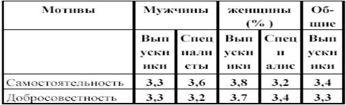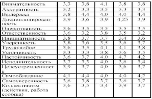Как видно из табл.3, показатели оценок большинства качеств распределены равномерно и в большинстве случаев ниже четырех баллов, что свидетельствует об отсутствии направленной работы преподавателей. Студенты и специалисты при таком уровне развития личностных качеств, при прочих равных условиях, не смогут составить достойную конкуренцию и занять соответствующее рабочее место. Условно разделим выделенные качества на группы профессиональных (внимание, оперативность, усидчивость, исполнительность, самостоятельность, инициативность), волевых (целеустремленность, выдержка, настойчивость, самообладание, уверенность, самоотверженность) и нравственных (добросовестность, трудолюбие, дисциплинированность, коллективизм, ответственность, аккуратность). Проанализируем их оценки. Студенты-мужчины удовлетворительно оценили влияние занятий физкультурой и спортом на развитие волевых качеств (X = 3,8 балла), ниже – развитие профессиональных и нравственных качеств (X = 3,50 и 3,53 балла соответственно). Из волевых качеств высоко оценены качества "самообладание" ( X = 4,15 балла), "целеустремленность" (X = 3,9 балла), из нравственных "дисциплинированность" (X = 3,9 балла), из профессиональных – "инициативность" (X = 3,8 балла).