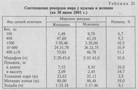 Как видно из таблицы, наибольшие различия наблюдаются в скоростно-силовых и сложно-технических видах легкой атлетики, а также в беговых дисциплинах, где спортивный результат зависит от скоростной выносливости. Незначительное отставание в толкании ядра связано с малым его весом (4 кг против 7,25 кг). Поэтому при подготовке женщин нельзя забывать об этих особенностях женского организма и об их физических возможностях в зависимости от той или иной специализации.
