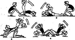 15.И. п. — сидя лицом друг к другу, руки за головой, полусогнутые ноги одного зажаты между полусогнутыми ногами другого. Одновременные наклоны назад возможно ниже и возвращение в и. п. (вариант упражнения: наклонившись назад, повороты туловищем налево и направо) (см. рис. 2, 4).
