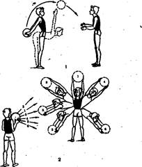 12.И. п. — стоя ноги врозь, лицом друг к другу. Первый выполняет серию бросков в строго заданные точки пространства около партнера, второй ловит мяч, не отрывая ног от пола, и возвращает его первому. Затем партнеры меняются ролями (см. рис. 3, 2),