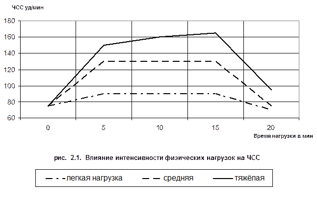 При легкой физической нагрузке ЧСС сначала значительно увеличивается, затем постепенно снижается до уровня, который сохраняется в течение всего периода стабильной работы. При более интенсивных и длительных нагрузках имеется тенденция к увеличению ЧСС, причем при максимальной работе она нарастает до предельно достижимой. ЧСС увеличивается пропорционально величине мышечной работы. Дальнейшее повышение нагрузки уже не сопровождается увеличением ЧСС (Дубровский В.И., Смирнов В.М. 2002).