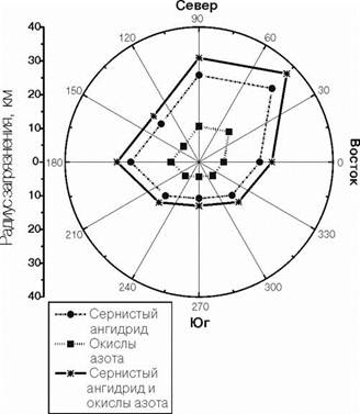 Анализируя данные табл. 3, констатируем, что в Кемерово юго-восточный и юго-западный ветра более чем на 10 км разносят сернистый ангидрид в концентрациях выше суточной предельно допустимой нормы. В Красноярске - юго-западный ветер разносит окислы азота в концентрациях выше предельно допустимой нормы почти на 10 км, т.е. наиболее опасным является северо-восточное направление от промзоны. В Новосибирске юго-восточный, южный и юго-западный ветра распространяют cернистый ангидрид до 14 км и т.д. Как подтверждают исследования [8], сернистый ангидрид и окислы азота при совместном воздействии на организм человека дают повышенный интегральный отрицательный эффект, поэтому границу предельно допустимой концентрации по суммарной величине этих выбросов следует определять значительно дальше от центра, чем дает расчет по каждому ингредиенту в отдельности. Как видно из табл. 3, расстояния до предельно допустимых значений концентраций заметно увеличились. Так, в Кемерово - до 15 км в северо-восточном направлении; в Красноярске - до 24 км в том же северо-восточном направлении; в Новосибирске - до 20 километров - в восточном и северо-восточном направлениях; в Омске -почти до 37 км в северо-восточном направлении; в Челябинске - до 28 км в том же направлении. Вместо таблиц результаты удобно представлять в виде круговых диаграмм. Так, диаграмма для Омска приведена на рис. 1. Она дает наглядное представление о наиболее опасных направлениях.