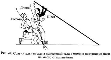 Одним из факторов, определяющих эффективность перевода горизонтальной скорости в вертикальную, является угол постановки толчковой ноги. Во всех прыжках на место отталкивания нога ставится быстро, энергично и жестко, в момент соприкосновения стопы с опорой она должна быть выпрямлена в коленном суставе. Приближенно угол постановки толчковой ноги определяется по продольной оси ноги, соединяющей место постановки с линией поверхности. В прыжках в высоту он наименьший, далее, по возрастанию, идут тройные прыжки и прыжки в длину, наибольший угол — в прыжках с шестом с разбега (рис. 44).