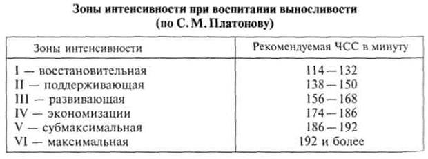 Результат в легкой атлетике зависит от высокого уровня выносливости и диктует определенную избирательность тренировочных воздействий, которые обеспечиваются аэробными (с доступом кислорода), анаэробными (без доступа кислорода) и аэробно-анаэробными (смешанными) процессами организма спортсмена. В таблице 4 зоны интенсивности распределены по показателям ЧСС во время той или иной тренировочной работы при воспитании выносливости.