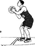 Расположение по одной линии (рис. 2а)— стопа со стороны бросающей руки, плечо, кисть и мяч находятся в одной вертикальной плоскости с корзиной. Расположение стопы, одноименной бросающей руке, должно быть каждый раз в одном и том же месте, и стопа должна смотреть на корзину или слегка влево от линии, перпендикулярной линии штрафного броска. Поставьте пальцы доминирующей/ведущей стопы (правой стопы — для правшей и левой — для левшей) как раз в центр линии штрафного броска. Корты из древесины твердых пород уже имеют нужные «дырочки для ногтя» по центру с целью измерения. На других покрытиях на этом месте делают отметку. Поставьте стопу вблизи центра и направьте заднюю стопу на угол щита с той же стороны (правая стопа, левый угол и наоборот). Располагайте стопы на ширине плеч в уравновешенной, со стоящими уступом стопами стойке.