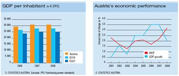 Согласно предварительным вычислениям, в 2008 австрийская экономика выросла на 2.0 %. Несмотря на уменьшение по сравнению с уровнем в 2007 (3.5 %), это развитие существенно превышает средний рост 27 государств ЕС (0.8 %) и других 16 европейских государств (0.7 %). Валовой внутренний продукт в текущих ценах рос на €11,1 миллиардов, или приблизительно на 4.1 %, и составил €281,9 миллиарда. Это составляет 33 800€ (+3.6 %) ВВП на душу населения.