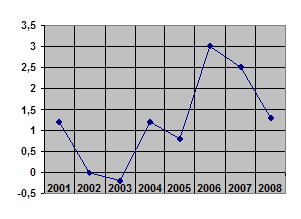 Так, в 2008 году объем ВВП составил 2 492,0 млрд. Евро превысив показатель предыдущего года на 1,3 %(Рис 6, 7)