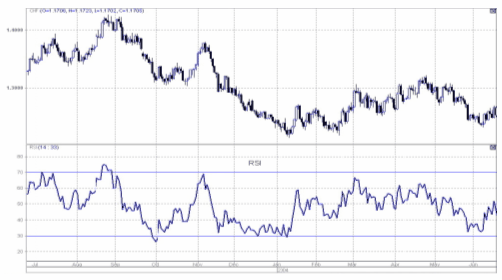 Индекс относительной силы (RSI) Разработан Дж. Уиллером Мл. В 1978 году, в настоящее время является одним из самых популярных осцилляторов. RSI измеряет относительную силу рынка, отслеживая цены закрытия. Это опережающий или синхронный индикатор, он никогда не запаздывает.