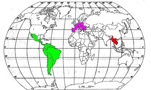 Цветами обозначены: Белый - регионы с долей в мировом экспорте менее 3% Зеленый - регионы с долей свыше 3% Сиреневый - регионы с долей 10% Красный - регионы с долей свыше 75% |