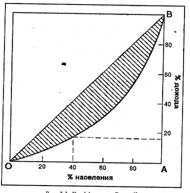 Прежде всего, строится график, на горизонтальной оси которого откладывается нарастающим итогом процент населения, а на вертикальной – процент дохода, которым соответствующая часть населения владеет. Получается линия, которая называется кривой Лоренца. На рисунке видно, что, к примеру, низкодоходные 40% населения получают немногим меньше 20% совокупного дохода. Далее проводится линия ОВ по углом 45% - в результате образуется заштрихованная фигура. Отношение ее площади к площади треугольника ОАВ и есть коэффициент Джини (Егишянц С.А. Тупики глобализации: торжество прогресса или игры сатанистов? – М.: Вече, 2004. – с. 94).