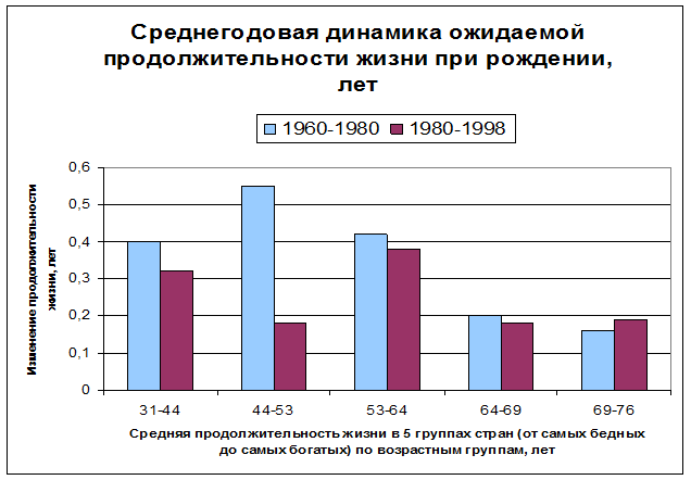Можно остановится на социальных проблемах подробнее: смысл экономического роста – улучшение жизни людей, а мондиализм именно это и обещает своим последователям. Известно, что с улучшением качества жизни растет и ее средняя продолжительность. В демографии есть показатель "ожидаемая продолжительность жизни при рождении". Он показывает, сколько может в среднем прожить только что родившийся человек, если все существующие процессы изменения уровня смертности продолжат свое развитие. Понятно, что по мере роста уровня жизни и развития социальных программ (борьба с бедностью, медицинское обслуживание и т.д.) этот показатель увеличивает свое значение. Рассмотрим его динамику в последние 40 лет в разных странах, сгруппированных на пять групп (см. диаграмму).