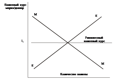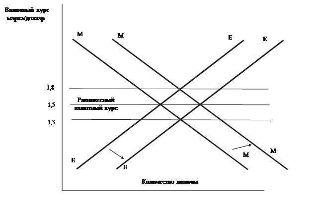 Предположим, что на рынок иностранной валюты выходят немецкие импортеры и экспортеры, ведущие торговлю с США. Кривая спроса на доллары (ММ) имеет отрицательный наклон: чем выше курс доллара, (соответственно ниже курс марки), то есть чем больше марок стоит один доллар, тем меньше спрос на доллары со стороны импортеров, поскольку американские товары становятся дороже для немцев. Компьютер в 1 тыс. долл. обойдется немцу в 2 тыс. марок при курсе 2 марки за доллар (1000 х 2) и только 1,5 тыс. марок при курсе 1,5 марки за доллар (1000 х 1,5). Кривая предложения долларов (ЕЕ) имеет положительный наклон: чем выше курс доллара (соответственно ниже курс марки), тем больше спрос на немецкие товары, так как они становятся дешевле для иностранцев. При курсе 1,5 марки за доллар машина ценой 30 тыс. марок будет стоить американцу 20 тыс. долл., а при курсе 2 марки за доллар 15 тыс. долл. Следует заметить, что кривые ММ и ЕЕ строятся для заданных уровней цен и постоянных объемах совокупного спроса в обеих странах.
