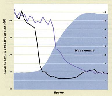 Дальнейшее снижение смертности при большем снижении рождаемости (вследствие перехода от многодетной к малодетной семье) |