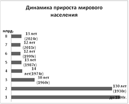 Первого миллиарда население мира достигло в 1810г. Каждый последующий миллиард достигался за все более краткие сроки. В 1900г. численность населения мира составила 1,6 млрд. человек и за сто лет увеличилась практически в 4 раза, достигнув 6,1 млрд. Население достигло 6млрд. в 1999г., буквально за 12 лет после прохождения порога в 5млрд. Согласно официальным демографическим оценкам ООН, за такой же промежуток времени, равный 12 годам, численность населения мира достигнет 7 млрд. человек в конце 2011г. (Таблица 2) По долгосрочному прогнозу она превысит 9 млрд. в 2050г. (Рисунок 3) и будет увеличиваться, по среднему варианту на 31 млн. человек в год.