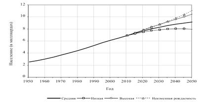 Рисунок 3 - Населения мира 1950-2050, согласно различным вариантам и прогнозам.