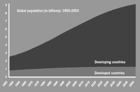Рисунок 4. Прирост численности населения мира обеспечивается в основном менее развитыми регионами. Источник: United Nations Population Division, World Population Prospects, The 2008 Revision.