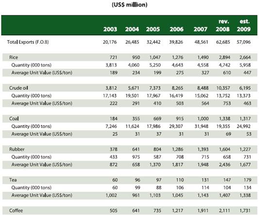 С 2003 года объем экспорта увеличился практически вдвое – с 20,176 млн. долл. До 57,096 млн. долл. Это произошло благодаря росту поставок риса, угля, кофе.