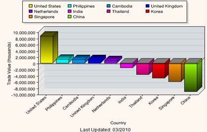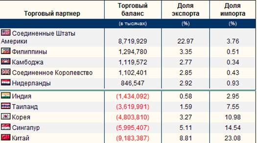 Что касается торгового баланса, то он положительный в торговле с США, Филиппинами, Камбоджией, Великобританией, Нидерландами. С Индии, Таиланда, Кореи, Сингапура и Китая Вьетнам больше импортирует (табл. 5).