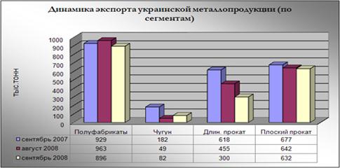 Из рис. 2.5 видно, что наиболее существенно падение экспорта коснулось сегмента длинномерного проката, объем которого по сравнению с августом сократился на 34% до 300 тыс. тонн. В денежном эквиваленте поступления от экспорта уменьшились на 40,8%, или на 214,23 млн. долл до 310,99 млн. долл. Небольшой разрыв в снижение физического и денежного объема поставок проката в условиях около 30-32% падения цен объясняется тем, что в сентябре многие предприятия осуществляли поставки по контрактам, заключенным еще в июле и августе. Очевидно, что по мере выполнения октябрьских договоров, в которых зафиксированы новые цены, разрыв между снижением физического и денежного объема экспорта вырастет до 1,6-1,8 раз [10].