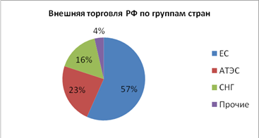 На диаграмме видно, что наибольшим удельным весом обладают страны ЕС и АТЭС. Страны, входящие в состав СНГ уступают.
