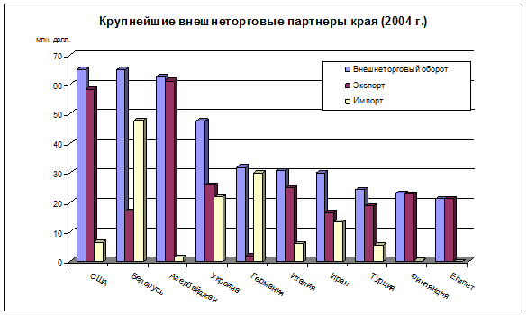 Постоянно значимыми партнёрами Ставропольского края, сохраняющими на протяжении последних 5 лет долю внешнеторгового оборота не ниже 2%, являются Италия, Германия, Украина, Беларусь, США и Турция. В 2003 г. в Ставропольский край поступило 13831,8 тыс. долларов США иностранных инвестиций (23,2% от уровня 2002 г.), в том числе прямых инвестиций - 12165,7 тыс. долларов (36,0% от уровня 2002 г.), портфельные - 75,7тыс. долл. США. Анализ динамики привлечения иностранных инвестиций в ставропольскую экономику позволяет говорить о посткризисной стабилизации данного процесса и прогнозировать на ближайшие годы усреднённое годовое значение притока инвестиций из-за рубежа в диапазоне 20 - 30 млн. долларов США. В 2004 г. в Ставропольский край поступило 18363,8 тыс. долл. США иностранных инвестиций, в том числе прямые инвестиции - 12628,8 тыс. долл. США, портфельные - 21,9 тыс. долл. США, прочие - 5713,1 тыс. долл. США. Анализ динамики привлечения иностранных инвестиций в ставропольскую экономику позволяет говорить о стабилизации данного процесса и прогнозировать на ближайшие годы усреднённое годовое значение притока инвестиций из-за рубежа в диапазоне 12 - 15 млн. долларов США, в случае отсутствия крупных инвестиционных проектов (свыше 10 млн. долл. США), и 30 - 50 млн. долл. США, в случае реализации отдельных крупных проектов (http://www.26.ru).