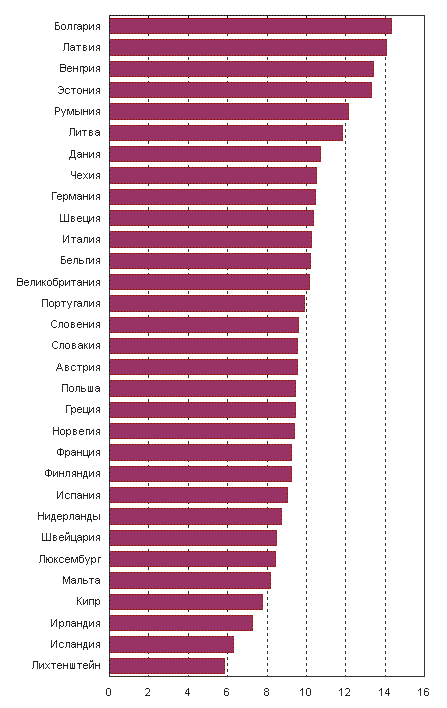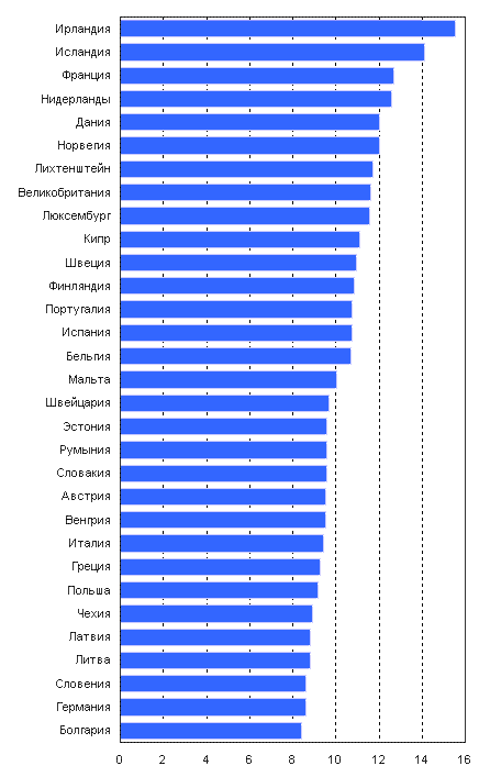 Самый высокий общий коэффициент смертности по-прежнему характерен для Дании (10,7‰), что связано с более высокой степенью старения населения (рис. 6). Ирландия, со своим относительно молодым населением, отличается, напротив, самым низким уровнем смертности - 7,3‰.[19]