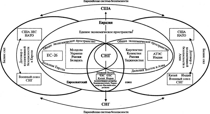 Законы развития сложных систем показывают, что ЕС будет интегрироваться с Азией через СНГ и никак иначе. Основой евразийской интеграции должна служить система институтов реализации общественно-политического согласия в рамках СНГ. Для Украины это означает следующее. В краткосрочной перспективе (до 5 лет) она может войти в состав ЗЕС, заключить договор об ассоциации с ЕС с длительным сроком действия (до 40-50 лет) и поменять вектор стратегического развития с европейской интеграции на интеграцию в СНГ на условиях построения институтов геополитического плюрализма. В долгосрочной перспективе договор с ЕС и членство в ЗЕС послужат основой для интеграции в ЕС в составе СНГ параллельно с РФ. Кроме того, такая самостоятельная суверенная Украина и ее членство в ЗЕС послужат инструментом реализации глобальных планов РФ - стать мировым центром влияния. Таким образом, Украина может, во-первых, стать самостоятельным экономическим и политическим региональным центром в составе СНГ, а во-вторых, послужить "экономическим мостом" в процессе интеграции ЕС и СНГ. Будущая конструкция Евразии представлена на рисунке.
