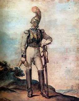 В воспроизводимом нами «Офицере карабинеров» из Лувра Жерико прежде всего несколькими точными и сильными перовыми линиями определил силуэт своего героя; затем легкими тонами расцветил парадную форму, кирасу и каску солдата. Нельзя не восхищаться здесь мастерством акварелиста—автора «Плота «Медузы», который сумел передать впечатление силы посредством столь прозрачной и тонкой техники. С помощью своеобразной, чуть приглушенной гармонии, созданной серыми, рыжеватыми, темно-голубыми и красными оттенками, переходящими в оттенки бистра, Жерико выявил силуэт офицера на фоне мягко намеченной листвы и каменистых холмов. И, наконец, несколькими нервными тенями передал пристальность взгляда и выражение покорности судьбе этого пребывающего в расцвете сил кирасира, который великолепно иллюстрирует роман Альфреда де Виньи «Неволя и величие солдата». «Мужественная серьезность, — замечает Ж. Опрескю,—и опыт солдат Империи, добытый в стольких трагических приключениях, никогда еще не находили более верной и более возвышенной интерпретации».