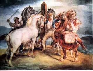 Эта потребность согласовать противоположности — классическую упорядоченность и романтическую напряженность, поиски стиля и изучение явлений жизни— со всей силой раскрывается в серии рисунков бистром, белой гуашью или акварелью, выполненных Жерико в Риме одновременно с подготовительной работой к знаменитой картине «Бег свободных лошадей» (то есть лошадей без всадников, которых в дни карнавальных празднеств пускали по узкой улице Кор со, ведущей от Пьяцца дель Пополо к Капитолию).