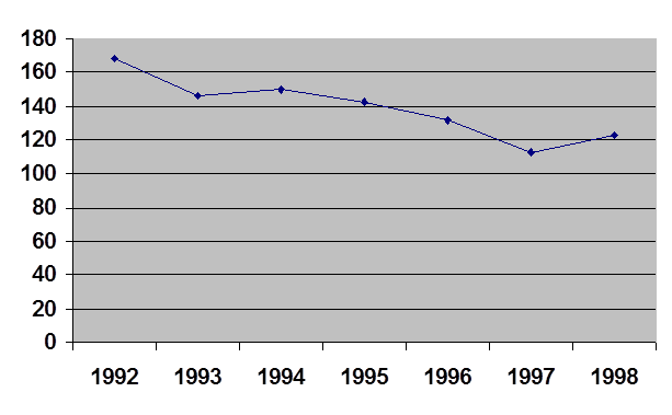 И, наконец, третий, современный этап золотодобычи в России начинает свой отсчет с 1991 года. И здесь следует констатировать, что с каждым годом Россия производит все меньше драгоценного метала. Так, в 1991 году было произведено золота 168 т; в 1992 году - 146 т; в 1993 году - 150 т; в 1994 году -143 т; в 1995 году - 132 т., в 1996 – 113 т., в 1997 – 123 т. Для сравнения - в 1990 году было произведено 270 т золота, что составило 10,1% общей мировой золотодобычи и переработки лома (в 1995 году этот показатель снизился до 4,6%).