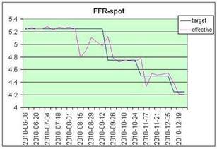 1. ставка по федеральным фондам и учетная ставка ФРС. В США ставка по федеральным фондам является той ставкой, по которой банки кредитуют друг друга – одалживают свои резервы, хранящиеся на счетах ФРС. Средневзвешенная ставка по кредитным сделкам, заключенным в ходе дневной торговли, называется «эффективной ставкой». Федеральная Комиссия по открытым рынкам устанавливает целевую ставку по федеральным фондам, которую еще называют «номинальной ставкой». Когда в новостях сообщается об изменении ставки, почти всегда имеется в виду именно номинальная ставка по федеральным фондам, а не учетная ставка, как пишут. В реальной жизни номинальная ставка может наблюдаться только случайно, когда совпадет с эффективной или в отдельных межбанковских сделках. Она служит в качестве цели, в диапазоне вокруг которой происходит торговля резервами. На графике внизу это хорошо видно.