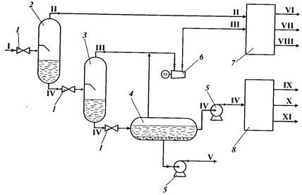 Подготовка нефти на промыслах: 1 — вентиль; 2, 3 — сепараторы 1-й и 2-й ступеней; 4— отстойник; 5— насос; 6— компрессор; 7 — газоперерабаты-вающий завод; 8— нефтестабилизационная установка; I — пластовая нефть; II, III — газы первой и второй сепарации; IV — нестабильная нефть; V — вода для закачивания в пласт; VI — метан; VII — этан; VIII — нестабильный бензин; IX — метан и этан; X — стабильная нефть; XI — фракция легких углеводородов