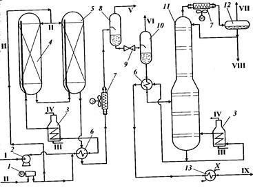 Сырье I смешивается с циркулирующим водородсодержащим газом IV. Далее реакционная смесь нагревается в теплообменнике 4 и печи 5 и поступает в верхнюю секцию реактора 2. Переменный диаметр реактора позволяет неравномерно распределять катализатор между секциями в соответствии с протекающими реакциями. Продукты из нижней части реактора 2 проходят теплообменники 4. Первое разделение жидкой и газовой фаз происходит в газовом сепараторе низкого давления 8(при 1 МПа). Газ из этого газового сепаратора компримируют компрессором 6 до давления 1,5 МПа, вновь смешивают с жидкой фазой, подаваемой из газового сепаратора 8, и разделяют смесь в газовом сепараторе высокого давления 7. Подобное решение узла сепарации, вызванное низким давлением в реакционной зоне, снижает унос бензина с водородсодержащим газом и повышает содержание в нем водорода. В колонне 9 осуществляют стабилизацию катали-зата при давлении 0,8—0,9 МПа. Из верхней части колонны уходят углеводородный газ VII и головная фракция VIII, которые передаются на газофракционирующую установку, а стабильный катализат отбирается снизу колонны.