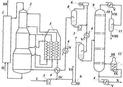Сырье I насосом 2 подают через теплообменник в трубчатую печь 3. В линию насоса врезана линия водородсодержащего газа II от компрессора 1. Нагретая до температуры 360—380 °С смесь сырья и циркулирующего газа проходит последовательно два реактора 4 и 5. Реакторы заполнены катализатором (алюмоникельмолибденовым или алюмокобальтмолиб-деновым). Предусмотрена возможность съема избыточного тепла реакции путем подачи в реакторы части холодного водородсодержащего газа. Продукты реакции в виде парогазовой смеси выходят из реактора 5, отдают часть тепла газосырьевой смеси, проходя через межтрубное пространство теплообменника 6, охлаждаются в воздушном холодильнике 7. Смесь поступает в сепаратор высокого давления 8, где от продуктов реакции отделяется водородсодержащий газ V, обогащенный сероводородом. Затем смесь из 8 попадает в сепаратор низкого давления 10, где вновь происходит выделение сероводорода и части углеводородных газов VI. Газы из сепараторов 8 и 10 уходят сверху и направляются на очистку моноэтаноламином и выделение сероводорода. Блок очистки газов от сероводрода моноэтаноламином описан в главе 2. В очищенный водородсодержащий газ добавляют водород для восполнения его расхода на гидроочистку.