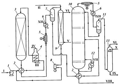 В продуктовой смеси, выходящей снизу из сепаратора 10, помимо целевой фракции дизельного топлива, содержится некоторое количество легких продуктов — тяжелые газовые компоненты и бензиновые фракции VIII. Чтобы отделить эти фракции, жидкие продукты направляют через теплообменник в стабилизационную колонну 11. Отпаривание легких фракций проводят, возвращая часть дизельного топлива из колонны 11 в печь. Балансовое количество гидроочищенного дизельного то плива IX проходит теплообменник 13 и уходит с установки. Углеводородные газы VII направляются на газофракционирующую установку.