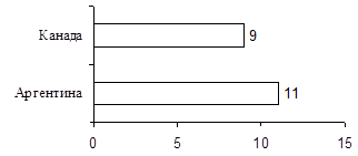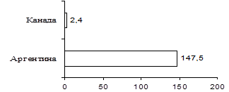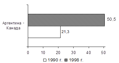 Между Аргентиной и Канадой разрыв по рассматриваемому показателю увеличивается, так как доля Аргентины сократилась до 21,3% ВВП Канады в 1998г. по сравнению с 50,5% в 1990г.