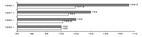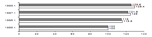 Расчет для Бразилии 1995г. 100; 1996г. 100+15=115; 1997г. 115(100+6)/100=121,9; 1998г. 121,9(100+3)/100=125,6. | |||