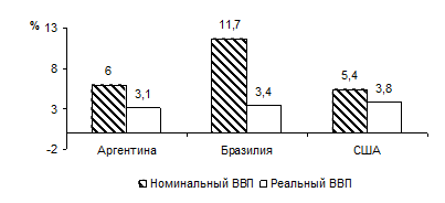 Рис. 9. Среднегодовое изменение номинального и реального ВВП в Аргентине, в Бразилии и в США в 1996-1998 гг., %