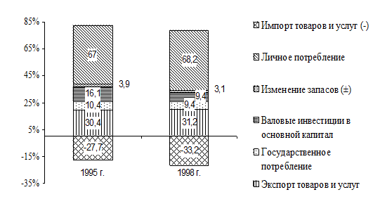 Выросла доля личного потребления с 67 в 1995 г. до 68,2 в 1998 г.