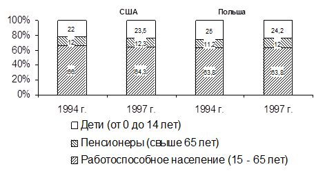 В США наблюдается абсолютное и относительное сокращение работоспособного населения (с 66 % в 1994 г. до 64,3 % в 1997 г.), связано это с увеличением населения свыше 65 лет и увеличением населения от 0 до 14 лет. Также отмечается рост рождаемости с 22 % в 1994 г. до 23,5 % в 1998 г.