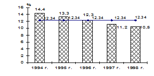 Снизилось государственное потребление с 10,4 в 1995 г. до 9,4 в 1998 г