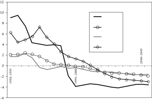 Естественный прирост населения, млн человек за пятилетие (1950–2050)[2]